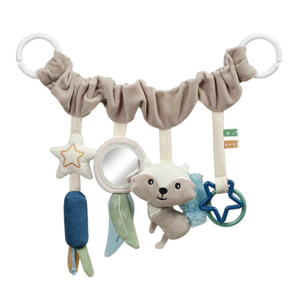 Róka függő játék babakocsiba és autósülésbe egy szenzoros termék, amely képes stimulálni a gyermek tapintását és látását, valamint javítani motoros képességeit. Mindössze annyit kell tennie, hogy rögzíti a babakocsira, bölcsőre vagy autósülésre, hogy szórakoztassa a gyermeket séták és utazások során. A szövetbe burkolt függő tárgy kellemes tapintású és bájos mosómedvével, biztonságos tükörrel, kellemes csengőkkel, valamint gyűrűvel és csillaggal van ellátva. Gondosan kiválasztott darabok vonzóak és **felkeltik a gyermek figyelmét**. A kicsi játszhat, felfedezheti a világot, és fejlesztheti látását és hallását.Praktikus rögzítés:A praktikus és univerzális rögzítő segítségével a játékot a babakocsihoz, autósüléshez és kiságyhoz is rögzítheti.Kis csengők:A csengők mozgás közben kellemes és finom hangot adnak ki. Ennek a hangnak a célja, hogy megnyugtassa a gyermeket séták közben.Susogó játék:A mosómedve farkában és levelében rejtett susogó darabok felkeltik a gyermek figyelmét, és egyúttal fejlesztik kognitív képességeit.Biztonságos tükör:A rugalmas tükör lehetővé teszi a gyermek számára, hogy lássa saját tükörképét.Különböző textúrák:Ha hagyja, hogy gyermeke különböző textúrákat tapintson meg, gazdagítja érzékszervi élményeit.Oktató játék:Mivel a darabok változatosak, a babával való játék kreatív.Műszaki jellemzők:Anyag: 100% poliészterMéret: 35 cm x 24 cmBaba életkora: 0 m+Biztonsági információk:Rögzítse a játékot a gyermek elérhetőségén kívül. A lehetséges balesetek elkerülése érdekében távolítsa el a játékot, amikor a gyermek elkezd próbálkozni a kézre és térdre állással mászó helyzetben.Távolítson el minden biztonsági elemet a játékról, amelyek veszélyesek lehetnek a gyermek számára.Minden alkalommal ellenőrizze a játék minőségét, mielőtt a gyermeknek adná. Csak a sértetlen játék biztosítja a gyermek biztonságos használatát. Dobja ki a játékot, amint az első sérülés jeleit észleli.Ajánlott felnőtt felügyelete mellett játszani.A játék megfelel az EN 71 szabványnak.Javasoljuk, hogy a csomagolást tartsa meg referenciaként. A csomagolást tartsa távol a gyermekektől. A csomagolás és a rögzítő elemek nem játékok, és egészségügyi kockázatot jelenthetnek a gyermek számára.Szállító: Babyono sp. z O.O., Kowalewicka 13, 60–002 Poznań, Lengyelország. +48 61 83 90 520,