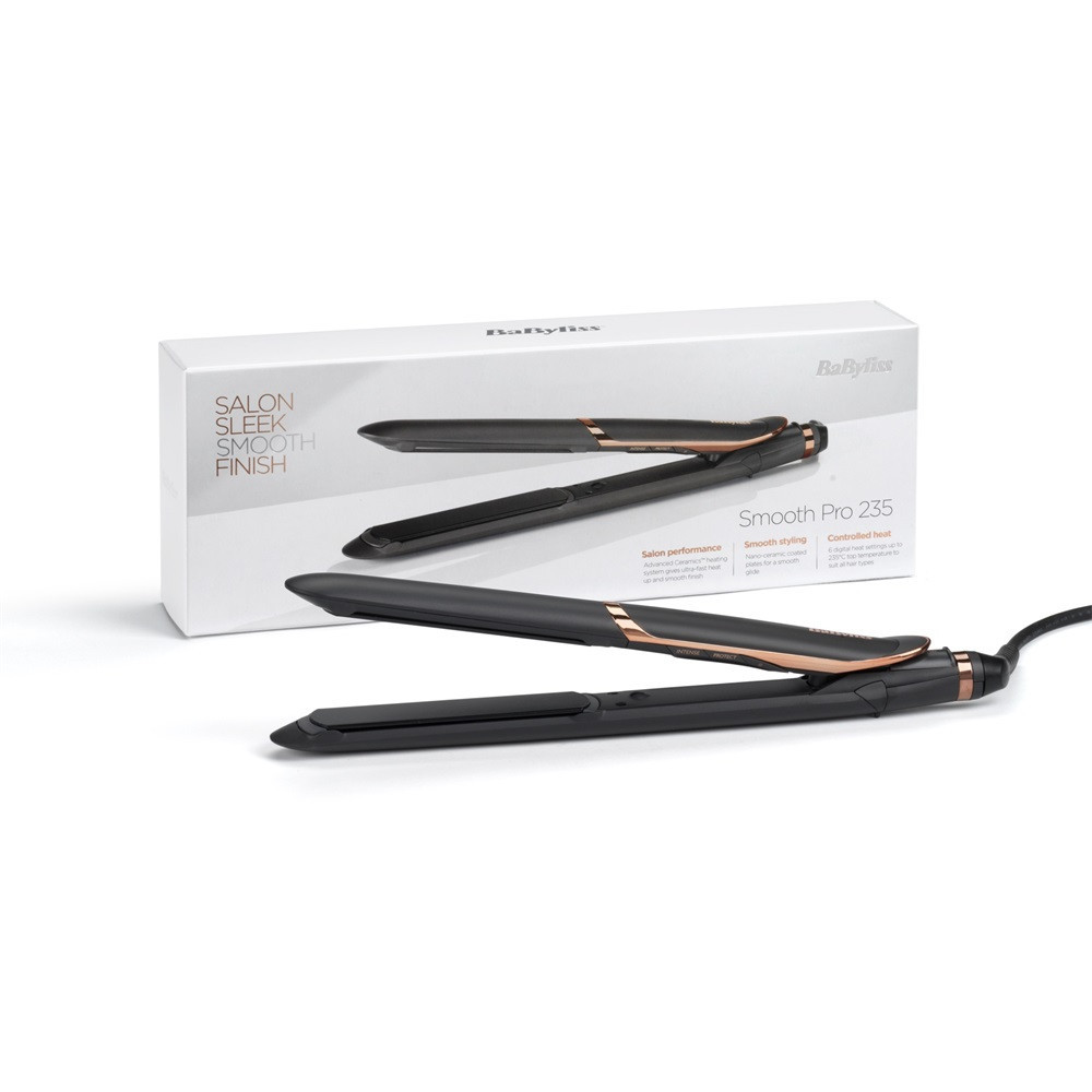 A BaByliss ST394E Smooth Pro 235 hajvasaló egy szalon minőségű hajvasaló, mely kombinálja nano-kerámia bevonatú simítólapokat egy nagy teljesítményű ionizáló technológiával, így biztosítva a hihetetlenül csillogó, egyenes hajat.