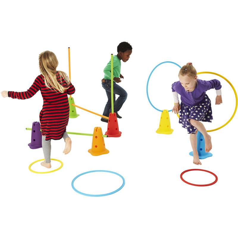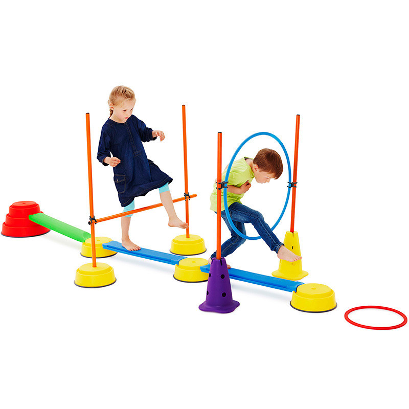 Az akadálypálya építéséhez az alábbi rúd szettet Egyensúlyozó rúd szett 6 db és tornakarikákat ajánljuk Tornakarika 35 cm 3 db