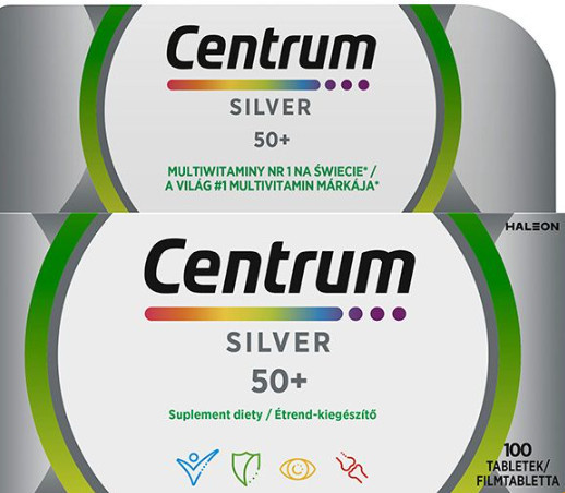 Kiváló minőségű étrend-kiegészítő formula az 50 év feletti korosztály számára. Az 50 évnél idősebb korosztály mikrotápanyag-szükséglete sajátos. Ezért a Centrum Silver 50+ A-tól Z-ig speciálisan kialakított és kiegyensúlyozott tápanyag-összetételét ezekre az igényekre szabták. Vitaminokat és ásványi anyagokat tartalmazó étrend-kiegészítő készítmény 50 éven felülieknek. B-vitaminokat (B1, B2, B6, B12), niacint és magnéziumot tartalmaz, melyek részt vesznek a normál energiatermelő anyagcsere-folyamatokban. Az A-, C- és D-vitamin, réz, szelén és a cink hozzájárulnak az immunrendszer normál működéséhez. Az A-és a B2-vitamin, valamint a cink hozzájárulnak a normál látás fenntartásához. Kalciumot, D- és K-vitamint tartalmaz, amelyek hozzájárulnak az egészséges csontozat fenntartásához. Cukorbetegek is szedhetik. Glutén- és laktózmentes. Összetevők Ortofoszforsav kalciumsói, Magnézium-oxid, L-aszkorbinsav, Tömegnövelő szerek: E 460, E 464, E 1200, Kálium-klorid, Csomósodást gátló anyagok: E 470b, E 551, E 553b, E 1202, DL-alfa-tokoferil-acetát, Nikotinamid, Kalcium-karbonát, Kalcium-D-pantotenát, Vas(II)-fumarát, Cink-oxid, Mangán-szulfát, Béta-karotin, Piridoxin-hidroklorid, Tiamin-mononitrát, Riboflavin, Növényi olaj (kókusz és pálma), Réz-szulfát, D-biotin, Retinil-acetát, Pteroilmonoglutaminsav, Króm(III)-klorid, Nátrium-molibdát, Kálium-jodid, Nátrium-szelenát, Fillokinon, Kolekalciferol, Cianokobalamin, Színezék: E132.