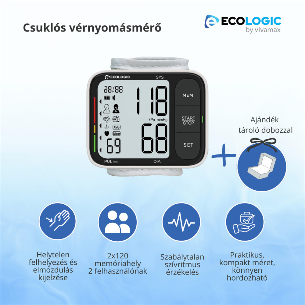 Kompakt csuklós vérnyomásmérő praktikus tárolódobozzal. Egygombos vezérlés, WHO skála szerinti értékelés, 2x120 memória, utolsó 3 mérés átlaga, automatikus kikapcsolás és elmozdulás érzékelés.