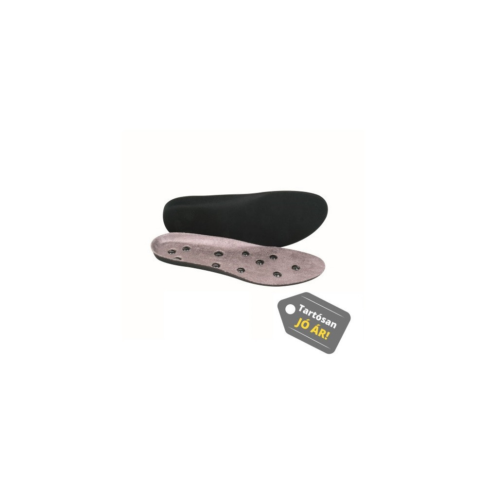 A Deluxe mágneses talpbetét magas sarokperemmel és kifejezetten rugalmas, puha talppal szolgálja a láb kényelmét és az ízületek védelmét. A nagy erősségű, egyenként 880 Gauss-os mágnesek a talp fontosabb akupunktúrás pontjainak stimulálásával fejtik ki jótékony hatásukat. Termékjellemzők: 2x11 db nagy méretű mágnes (egyenként 880 Gauss erősségű) Akupresszúrás masszázs Emelt sarokperem Rugalmas, puha talp Jó légáteresztés és nedvszívóképesség Ízületek tehermentesítése Méretek: 36, 37, 38, 39, 40, 41, 42, 43, 44 Anyaga: HI-POLY Tisztítása: rendszeres szellőztetés javasolt, vizes szivaccsal áttörölhető Használata: egész napos folyamatos viseletre alkalmas. Bőrirritáció esetén nem javasolt a használata. Figyelmeztetés: várandós hölgyek és szívritmus-szabályzóval rendelkező személyek ne használják a terméket! A termék nem minősül orvostechnikai eszköznek, használatára vonatkozó klinikai vizsgálatok nem készültek.