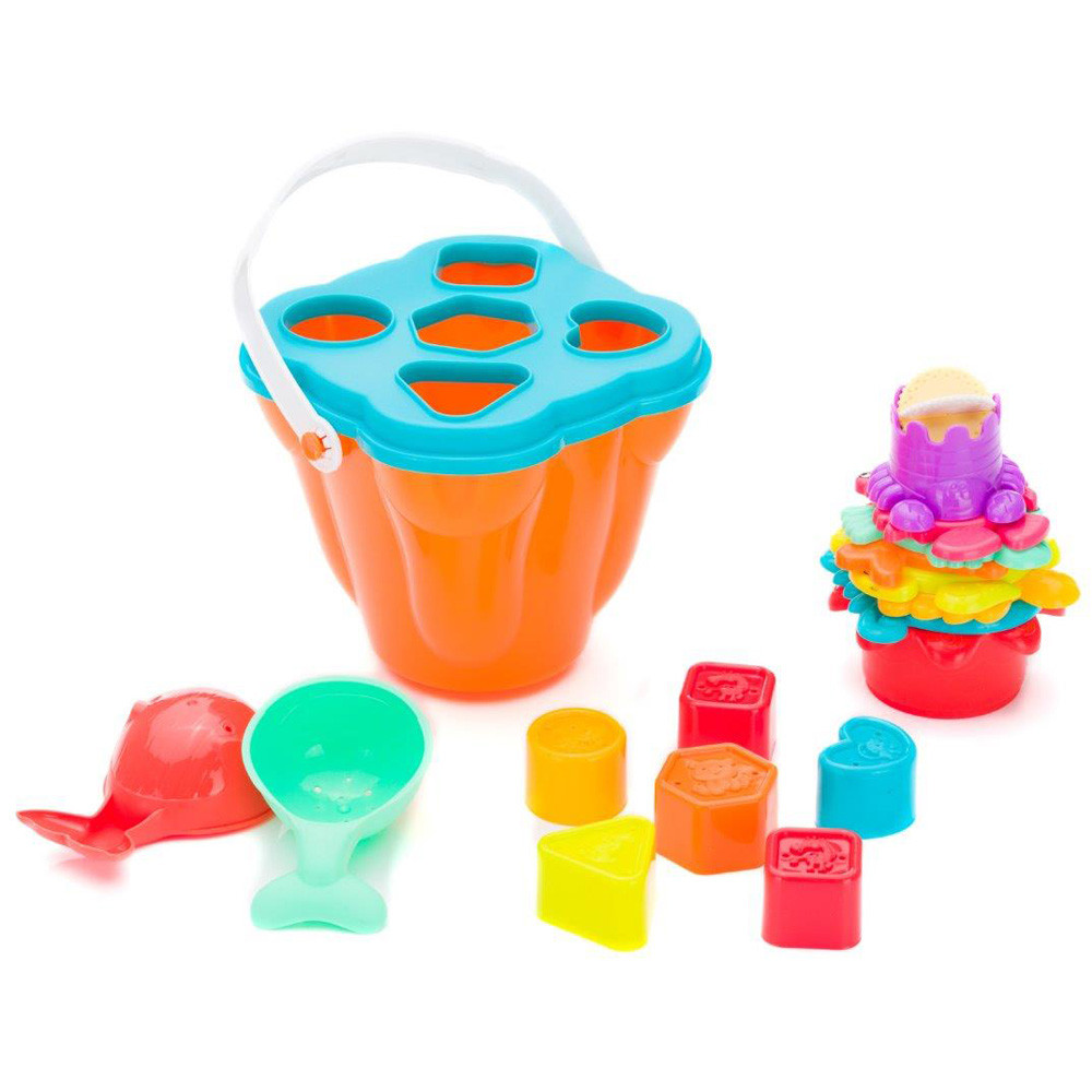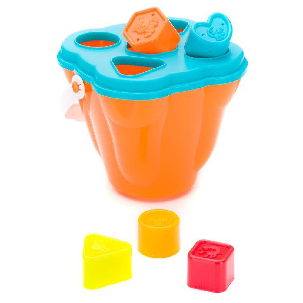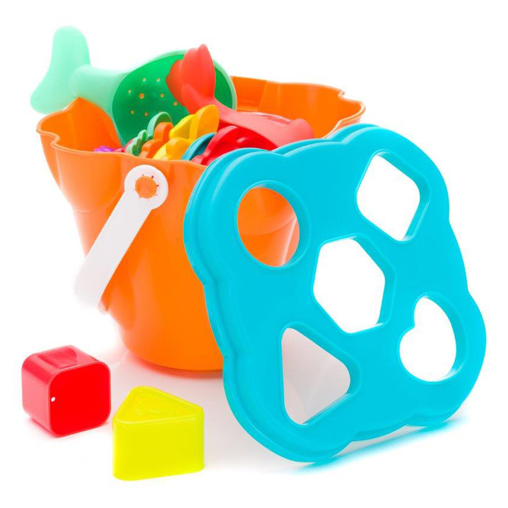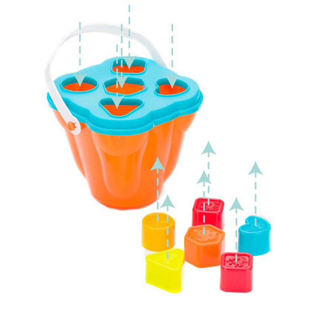 Játékvödör tetõvel és fogókával, 2 szitát, 6 formát és 8 egymásra rakható csészét tartalmaz. A formák mind tárolhatók a dobozban.