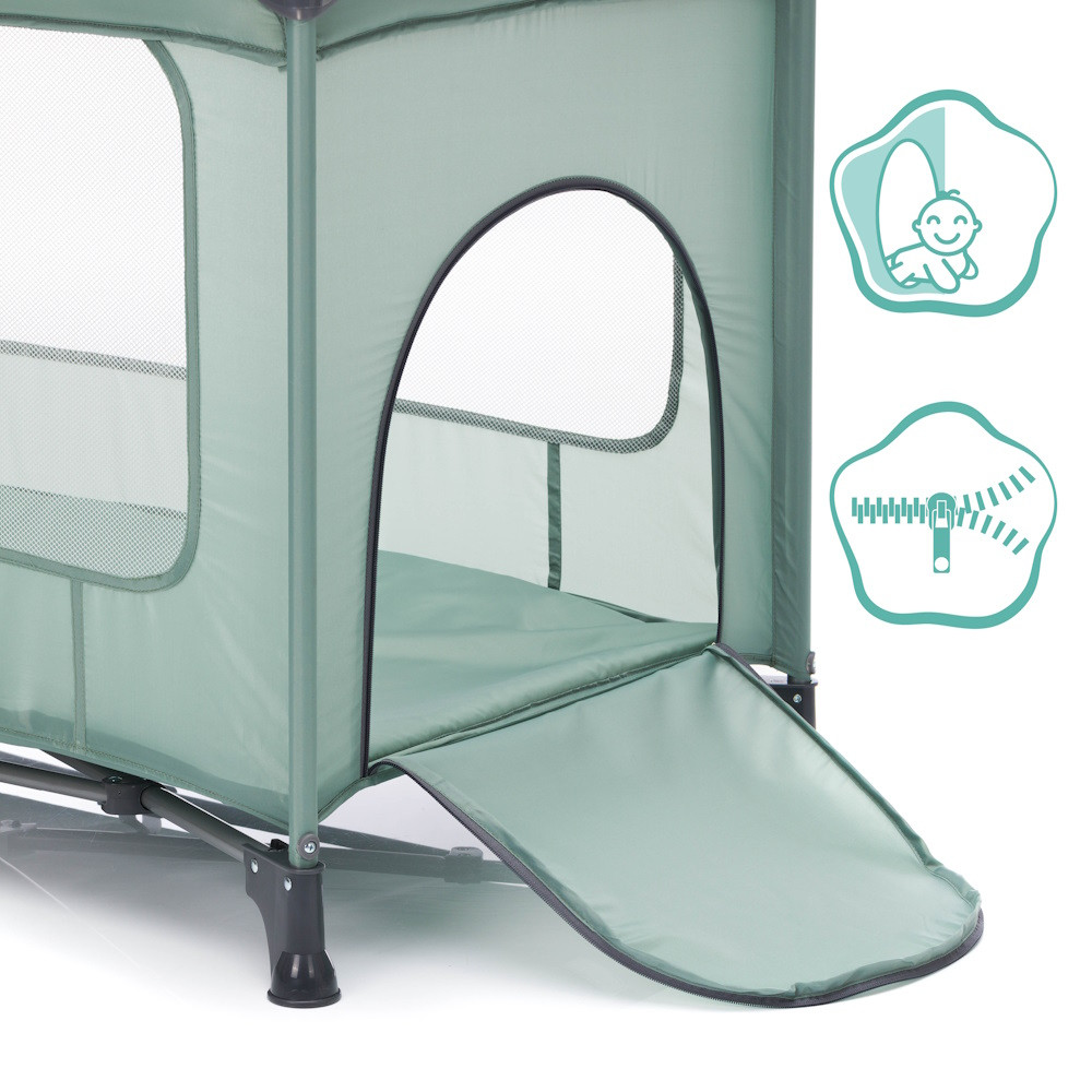 - Az utazóágy rövidebb oldalán lévõ cipzárral nyíló kibúvón át a nagyobb gyerekek önállóan be- vagy kimászhatnak.