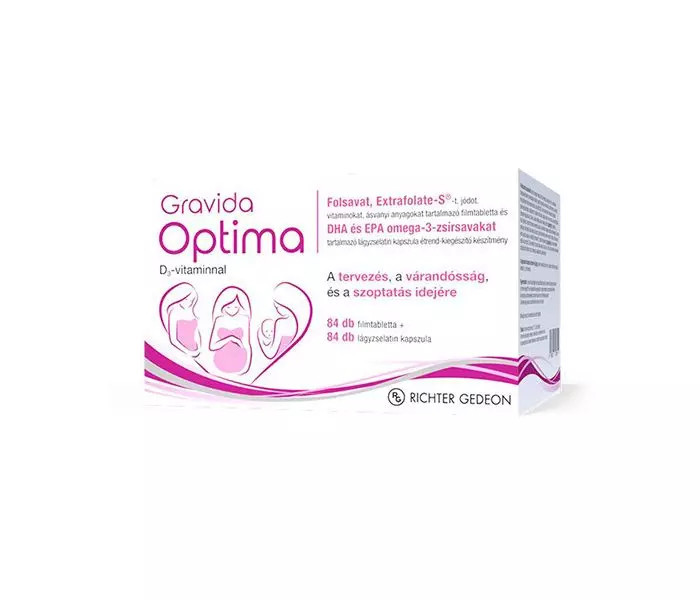 A Gravida Optima folsavat, kalcium-L-metilfolátot (Extrafolate-S®-t), vitaminokat, ásványi anyagokat tartalmazó filmtabletta és omega-3 zsírsavakat tartalmazó lágyzselatin kapszula. A fogantatás tervezésétől a várandósságon át a szoptatás végéig megnövekedett vitamin és ásványi anyag szükséglet kiegészítésére ajánlott. Az étrend-kiegészítő nem helyettesíti a kiegyensúlyozott vegyes étrendet és az egészséges életmódot. A készítmény nem szolgál betegség kezelésére, gyógyítására. Az ajánlott napi fogyasztási mennyiséget ne lépje túl! Gyermek elől elzárva tartandó! Forgalmazza:Richter Gedeon Nyrt.