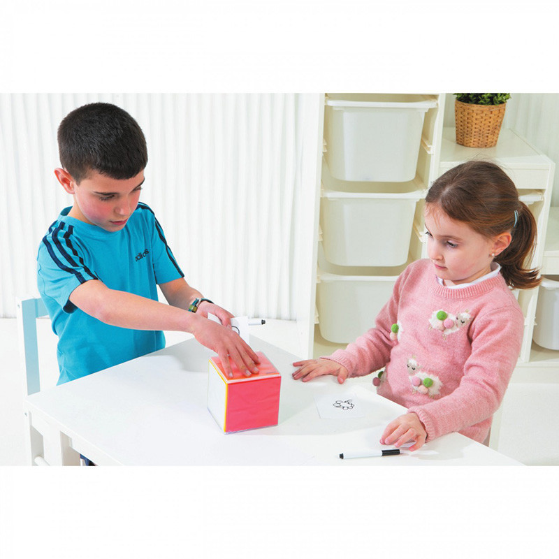 A rajzok a borítás alá csúsztathatóak, így a kockát egyedi mintával láthatják el a gyerekek.