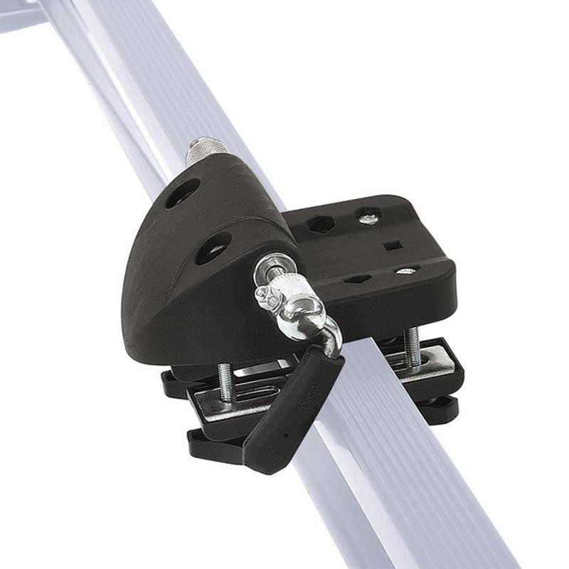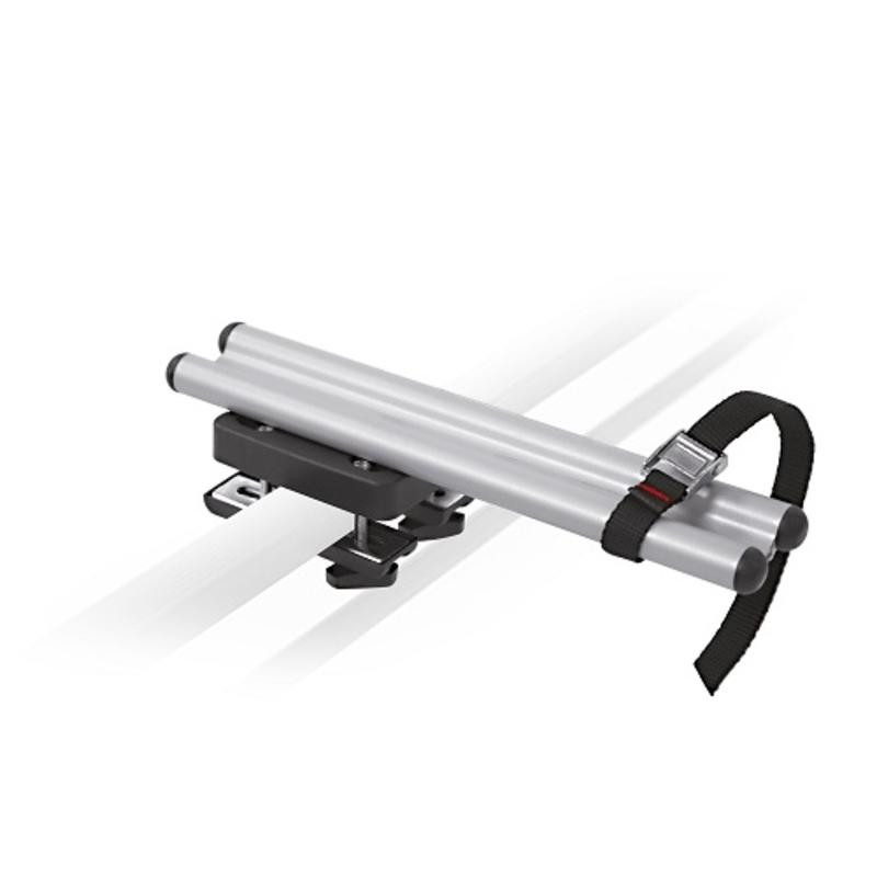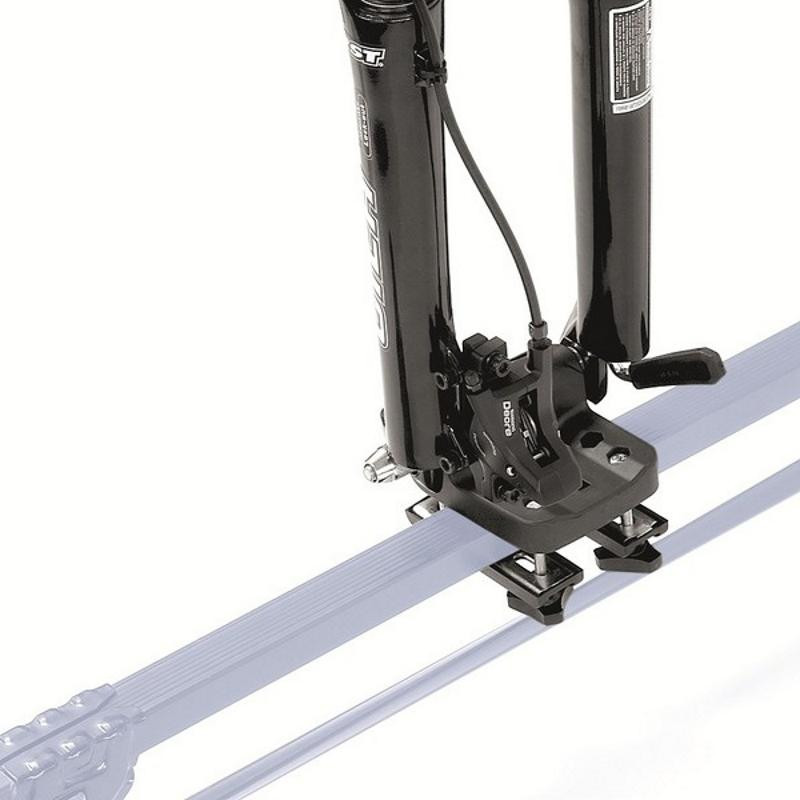 Keresztrúdra rögzíthető kerékpárszállító, 2 részes.Technikai adatok: - Az első rész gyorszárral rögzíti a villát, a hátsó rész alu kerékvályú, hevederes rögzítéssel - Tárcsafékhez is - Szerszám nélkül felszerelhető - Terhelhetősége max. 15 kg