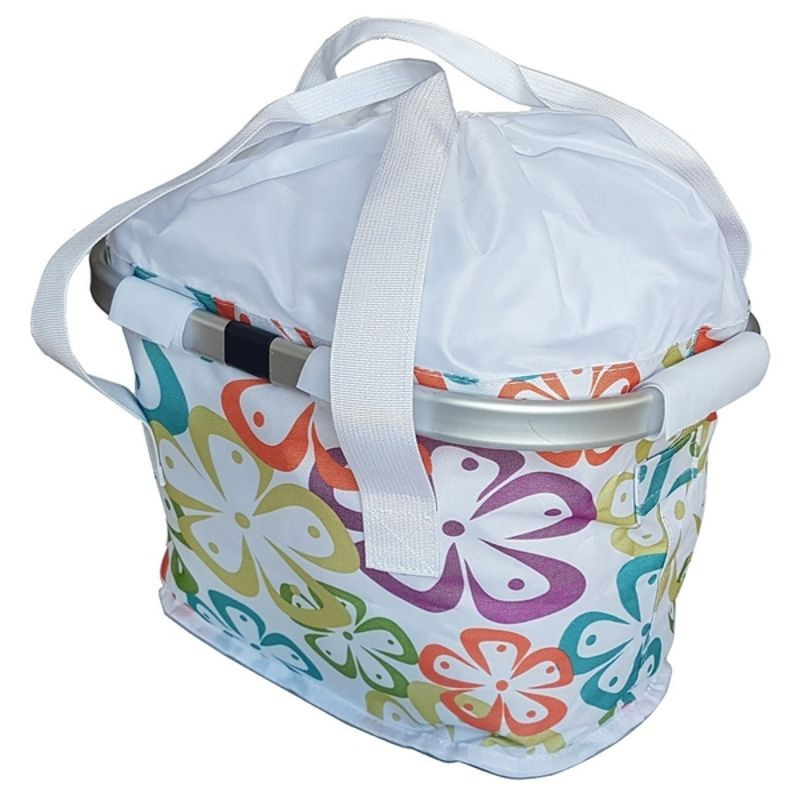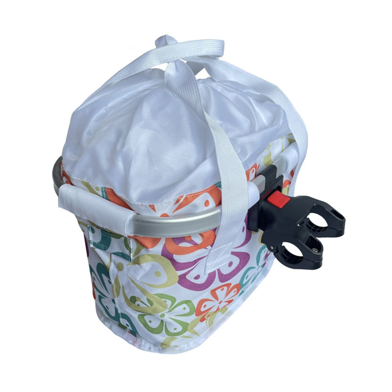 Kerékpár első kosár, szövet.Alumínium kerettel, gyorskioldóval.Tetején összehúzható.Fogantyúval.Méret: 33 x 23 x 25 cmSzín: nagy virág mintás