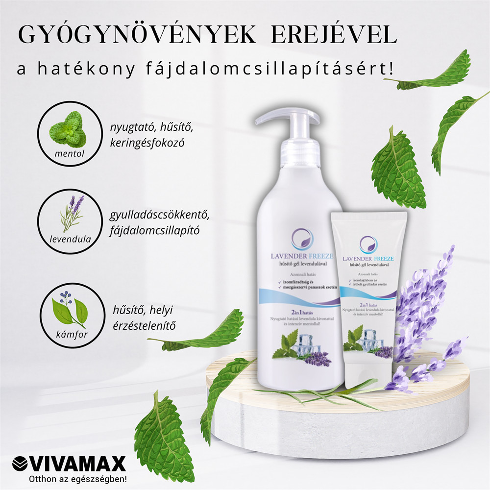 Lavender Freeze – és lefagy a fájdalom Hűsítő gél levendulával és intenzív mentollal. A gyógyszerkönyvi levendula olajat is tartalmazó hűsítő gél azonnali enyhülést nyújt mozgásszervi panaszok, izomfáradtság, sérülés esetén. A gyorsan beszívódó gél extra mentol és kámfor tartalma biztosítja a hosszan tartó, „hidegterápiás” hatást a túlhűlés veszélye nélkül. A levendula természetes gyulladás és fájdalomenyhítő hatása régóta ismert és biztonságosan alkalmazható. Legfontosabb hatóanyagok: levendula: gyulladáscsökkentő, lokális fájdalomcsillapító hatású kámfor: gyors hűsítő, helyi érzéstelenítő hatású mentol: nyugtató, hosszan tartó frissítő, keringésfokozó hatású Kiszerelés: 175 ml Lavender Freeze gél élettani hatása: A lágyrész (izom, ín) sérülések (rándulás, zúzódás, húzódás, túlerőltetés stb.) konzervatív kezelésének* része a sérült testrész mielőbbi hűtése. Hatására a szövetek, sejtek hőmérséklete csökken és az idegek vezetőképessége mérséklődik. Mindez enyhíti a fájdalomérzetet, csökkenti a bevérzést, a sérülés következtében kialakuló kóros izomspazmust (összehúzódást) és mérsékli a másodlagos ödéma kialakulását. A hatóanyagok megfelelő kombinációja a fizikai hűtés mellett lokális mikrokeringés fokozó hatású is. A helyi vérkeringés fokozásának eredményeként gyorsítja a szöveti regenerációt, az ún. gyulladási faktorok elszállítását és segít ellazítani az izmokat. A gyógynövények együttes hatása biztosítja a legeredményesebb gyulladás és fájdalomcsillapító hatást. *RICE (rest, icing, compression and elevation, azaz pihenés, jegelés, kompresszió és megemelés). Gyógyszerforma: A Lavender Freeze hatóanyagai vizes-alkoholos gélben vannak formulálva, mely gyógyszerforma különösen előnyös a hatóanyagok bőrbe szívódásának gyorsítására és az intenzív, elsődleges hűsítő hatás biztosításához. A készítmény alkoholtartalma ugyanakkor hozzájárul, hogy a bőrön pl. a sportsérülés következtében kialakuló apróbb sérülések, horzsolások ne fertőződjenek el. A vizes-alkoholos gél lehetővé teszi, hogy a hatóanyagok bejutását követően a készítmény gyakorlatilag „nyomtalanul” eltűnjön a bőrfelületről, a bőr nem lesz ragacsos, zsíros tapintású, ruhán foltot nem hagy.