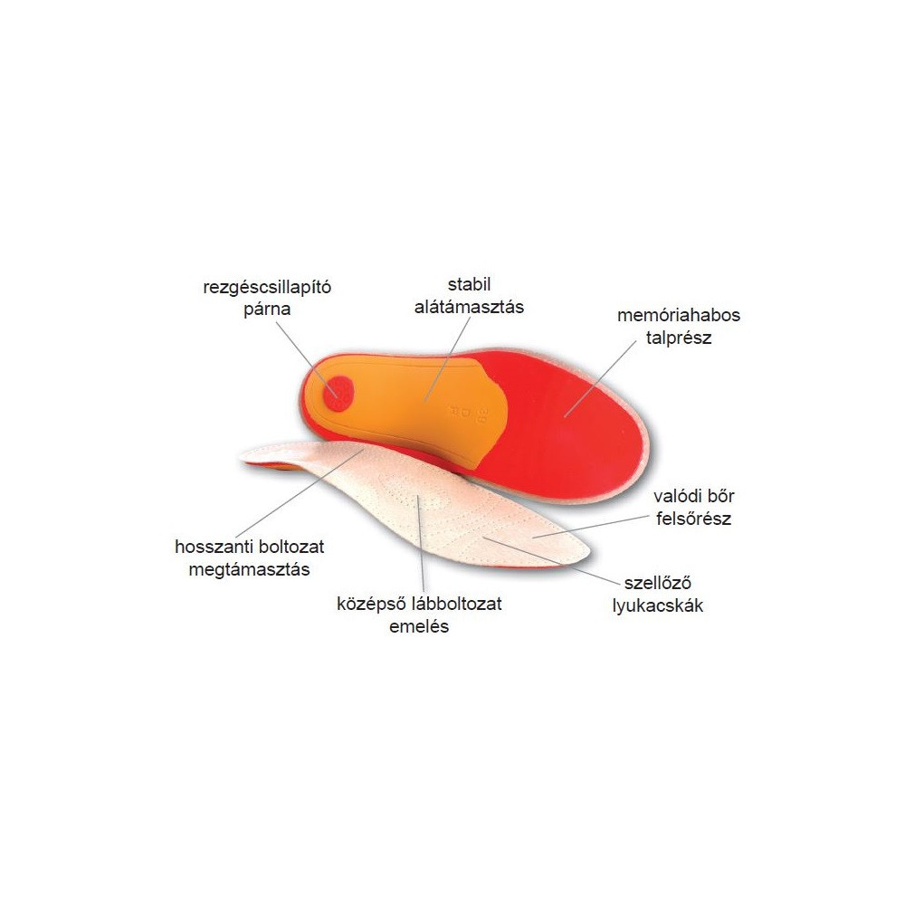Speciális rezgéscsillapító szerkezetű, optimális harántemeléssel és rugalmas sarokággyal, természetes bőr felsőréteggel.