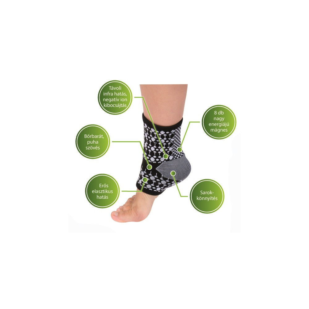 VivaFit mágneses bokaszorító turmalinnal • Intenzív mágnesterápia az anatómiailag fontos pontokon 8 darab, egyenként 1700-1850 Gauss erősségű mágneskoronggal. • A turmalin az általa kibocsájtott távoli infrasugaraknak és negatív ionoknak köszönhetően erősítheti a mágneses szorító ízületekre gyakorolt jótékony hatását. • A termék ideális sporttevékenységekhez (kocogás, tenisz, kosárlabda, golf, jóga vagy séta). Segítheti a sportsérülések utáni regenerációt. • Bőrbarát, puha szövésű, erős elasztikus anyag. • Tisztítása: langyos, ennyhén mosószeres vízben, kézzel mosható. • Boka körméret: M (21-29 cm) A szövet anyaga: spandex, latex. Terápiás javaslat: két hét folyamatos használatot 3-4 napos szünet kövessen. A kúrát a panaszok megszűnéséig többször is megismételheti. Ellenjavallat: gyermekeket váró nők és szívritmus szabályzóval rendelkező személyek nem használhatják. Amennyiben allergiás reakciót vagy egyéb szokatlan tünetet tapasztal, hagyja abba a termék használatát és egyeztessen kezelőorvosával! Többször használható termék.