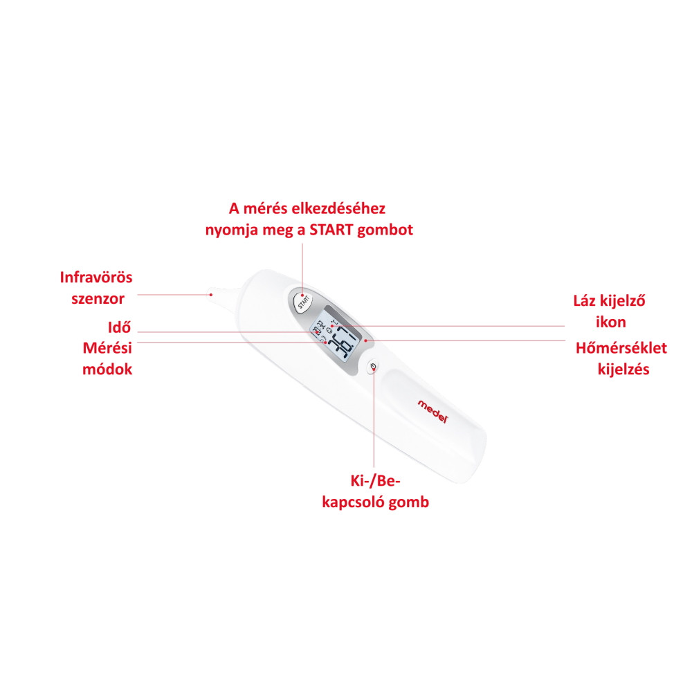 A Medel fülhõmérõ csomagában 15 védõkupak található a higiénikusabb és biztonságosabb lázmérés érdekében. Néhány másodperc alatt érzékeli a hõmérsékletet a mérés végén hangjelzéssel. Más hangjelzéssel jelzi a hõemelkedést és a lázat (ha eléri a 38 °C-ot). A 38 °C-os és afeletti testhõt szomorú ikonnal, az alattit mosolygós ikonnal is jelzi.