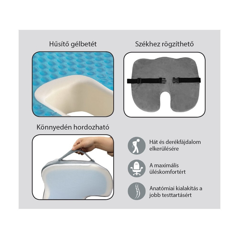 A memóriahabos anatómiai ülőpárna segít elkerülni, illetve enyhíteni a deréktájban keletkező nyomást. A memóriahab felveszi a test formáját és lassan veszi fel az eredeti alakját újra. Segítségével a gerincoszlop felveszi az optimális ívét, tehermentesítve ezzel az ízületeket és az izmokat. Kényelmes, ugyanakkor biztos tartást ad a gerincoszlopnak. Kifejezetten ajánlott azok számára, akik nap, mint nap ülőmunkát végeznek, illetve a derékfájással küzdőknek. A párna könnyedén hordozható a rávart fülnek köszönhetően. Az állítható, csattal ellátott pánt segítségével a székhez rögzíthető.