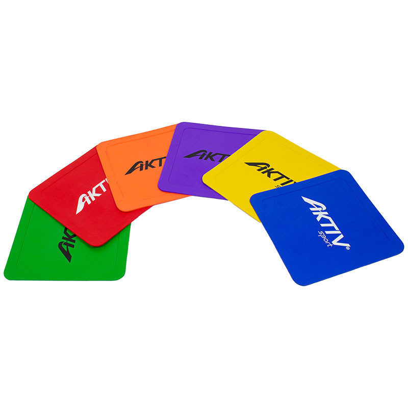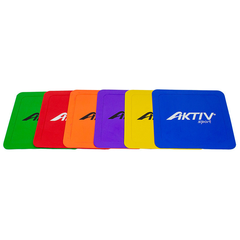 A szett 6 db, 23 x 23 cm-es padlójelölőt tartalmaz, kék, narancs, sárga, lila, zöld és piros színekben.