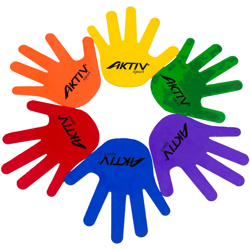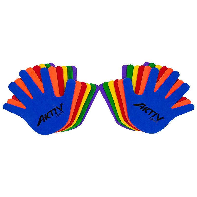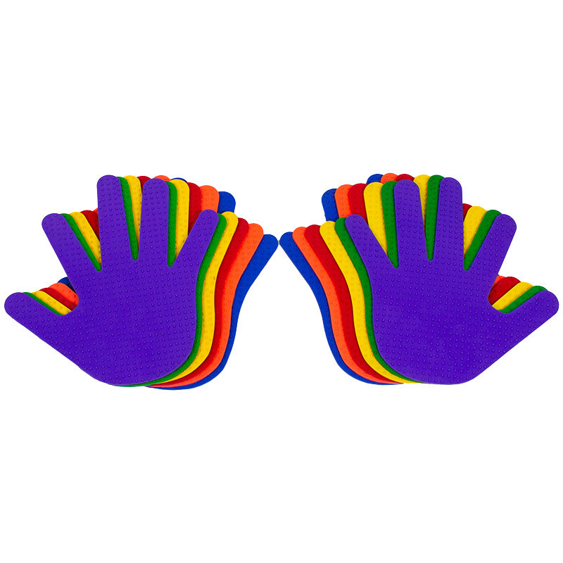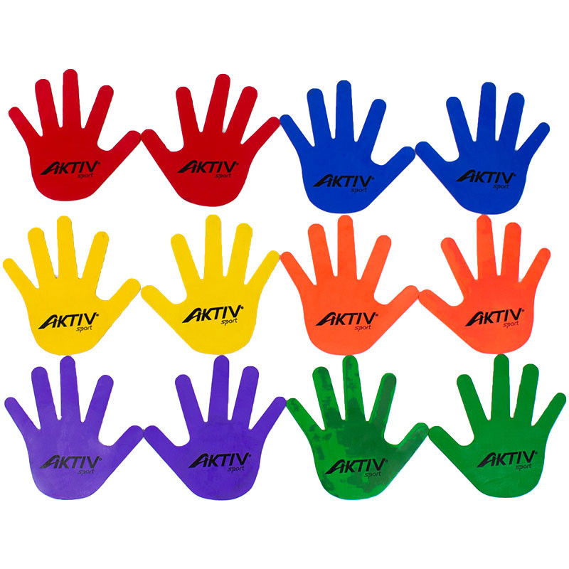 Tenyér formájú, puha, csúszásmentes gumi anyagból készült padlójelölő szett.A szett 12 db / 6 pár padlójelölőt tartalmaz, 6 különböző színben.Hordtáskával együtt.