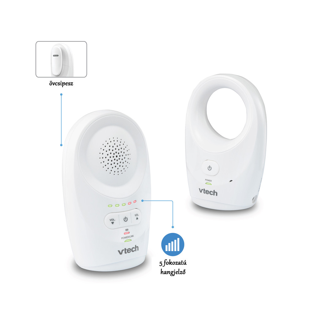 A V-Tech BM1111 egyirányú babaõrzõ DECT technológiájának köszönhetõen interferencia mentes, kristálytiszta hangátvitellel mûködik. Hatótávolsága nyílt terepen 460 méter.