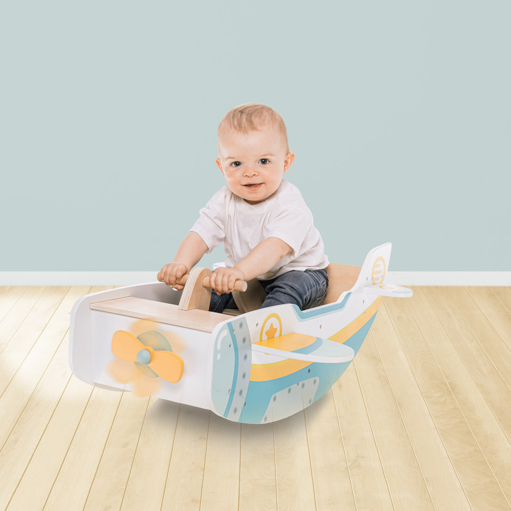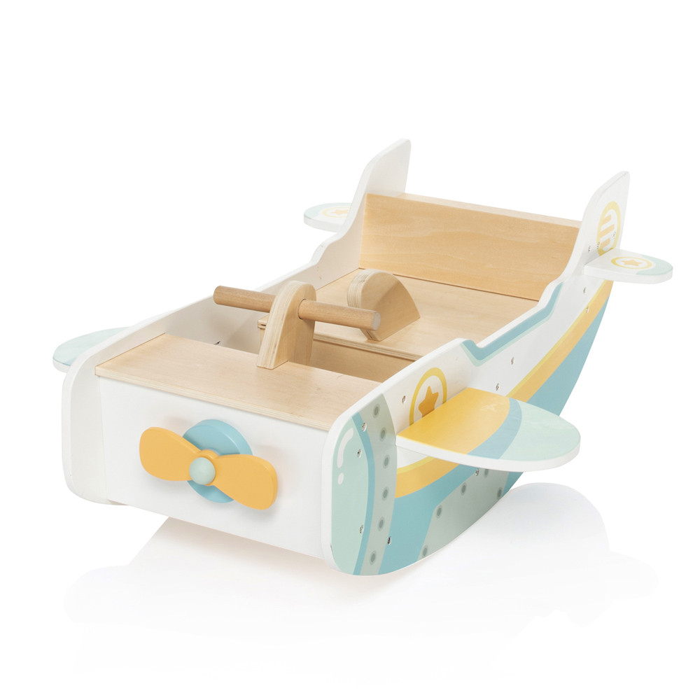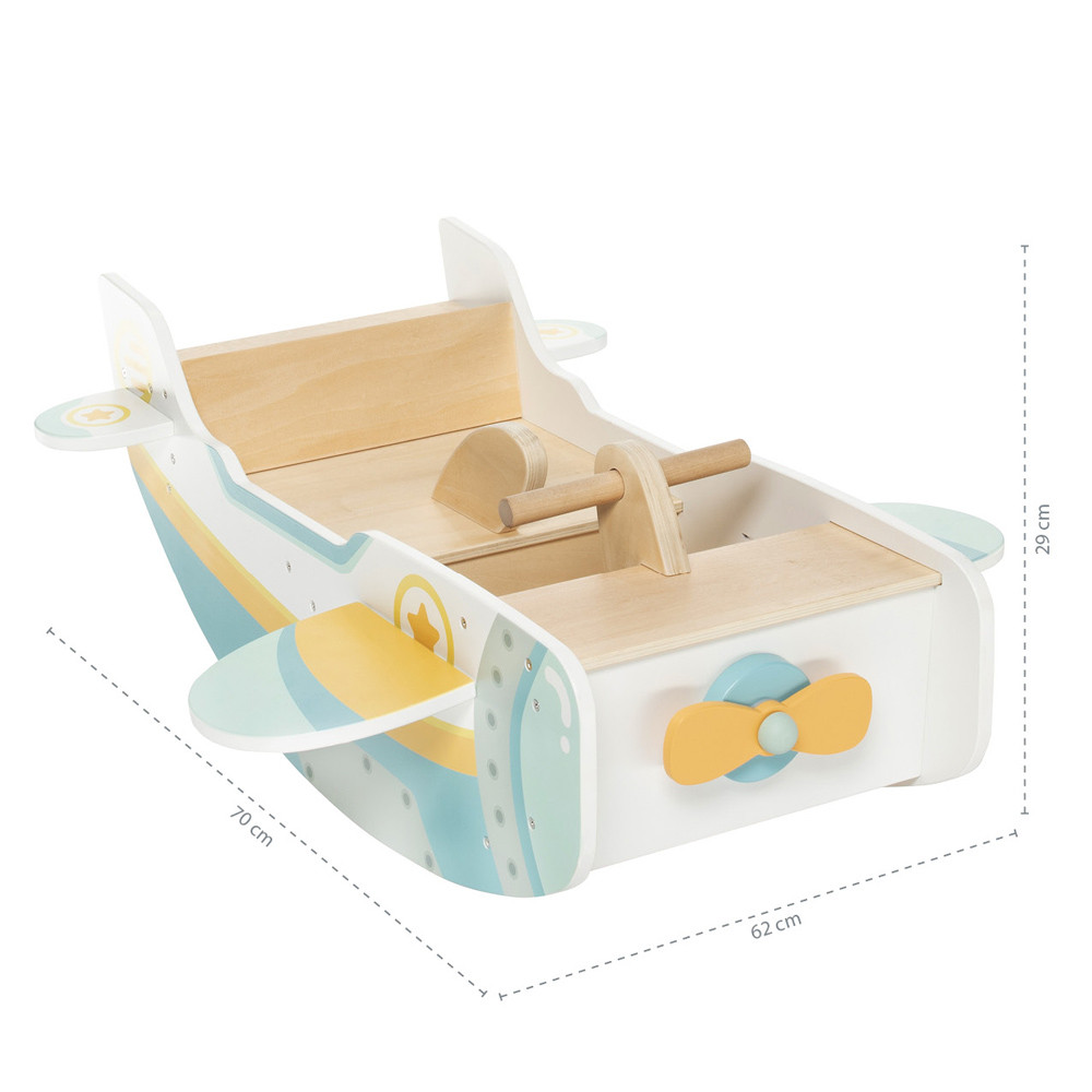 Felszállásra kész repülõgép, amely órákon át szórakoztatja a gyerekeket. A biztonságos lengést az elülsõ részben található kormány-kapaszkodó biztosítja. A széles ülés háttámlával rendelkezik, ha a gyermek csak finoman akar ringatni saját súlyával. A repülõ alakú hinta minõségi, tartós bükkfából készült. Minden felhasznált festék egészségre ártalmatlan és vízbázisú.