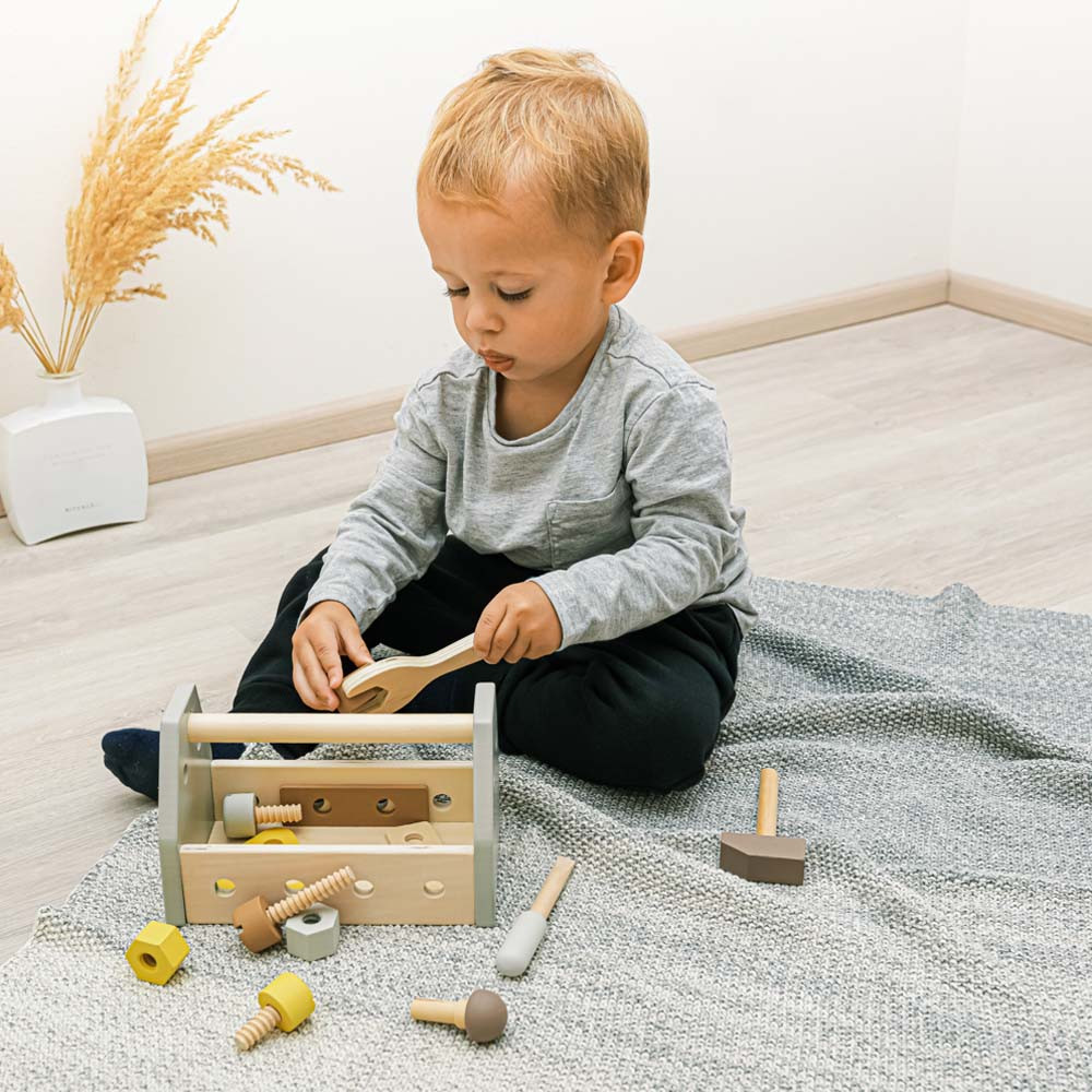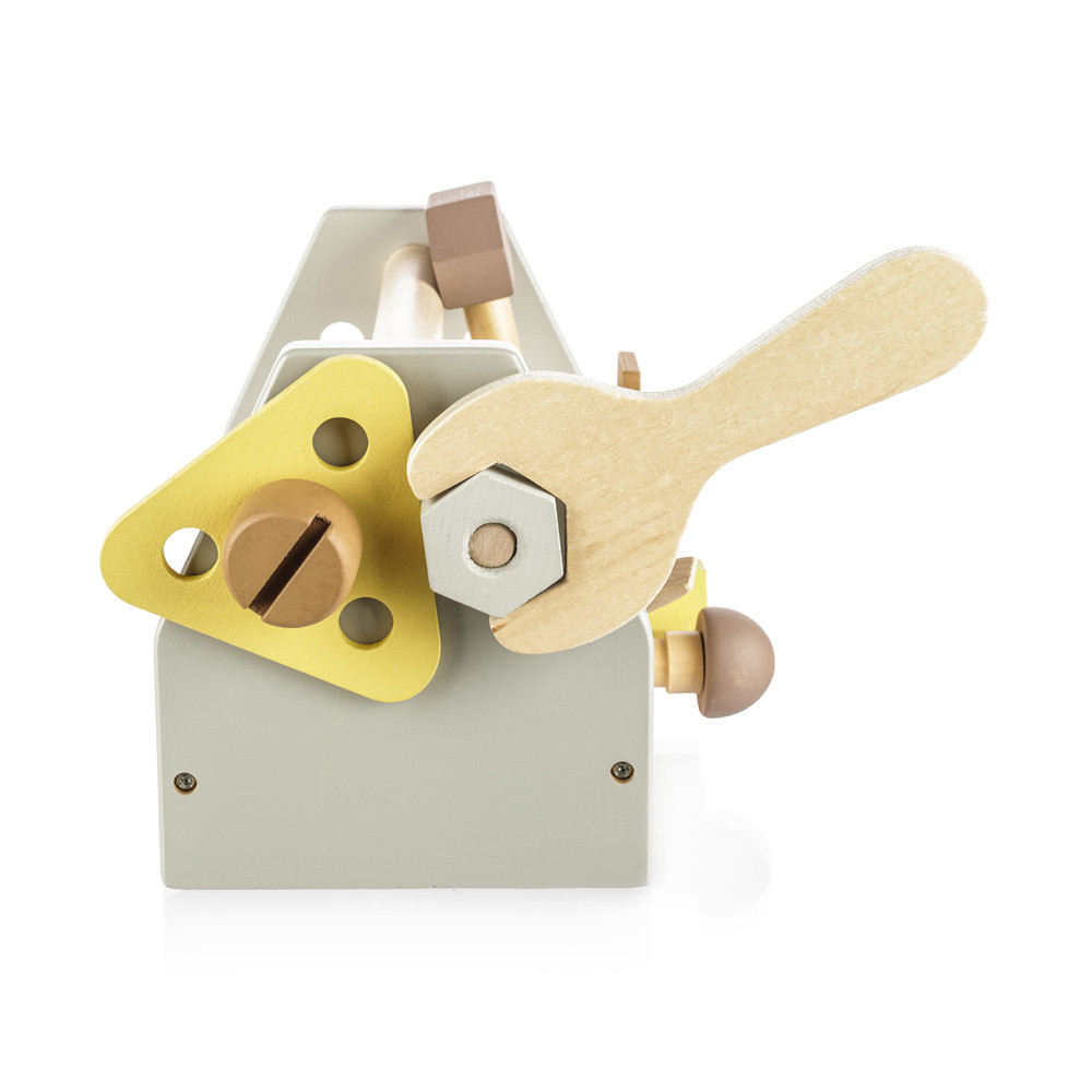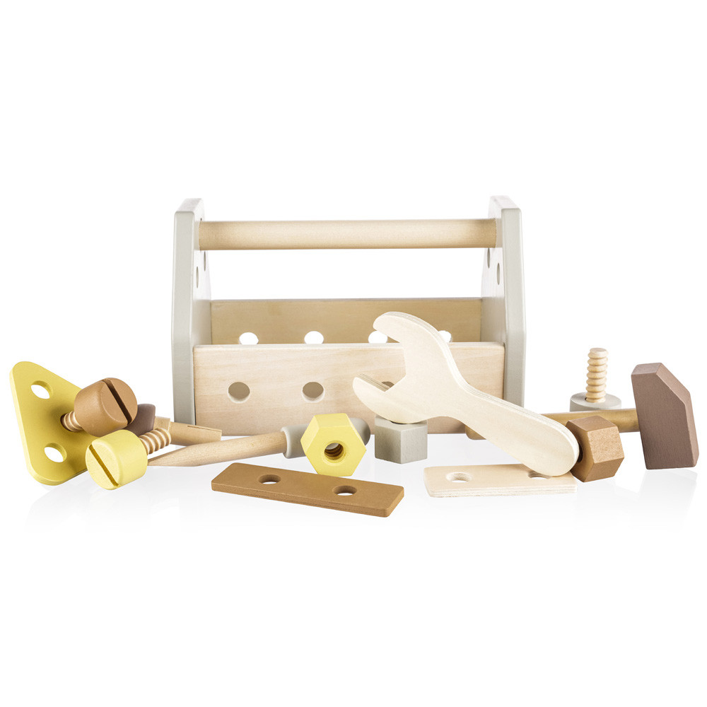 A kis szakképzett építõknek szánt elsõ szerszámkészlet tartalmaz egy kalapácsot, csavarhúzót, csavarkulcsot, 3 anyát, 3 csavart, 1 szöget, 3 fa alkatrészt és egy nagy dobozt, amelybe a játék minden alkatrésze elhelyezhetõ. A játék lehetõségei korlátlanok – a gyermek tud eszközöket készíteni és kezelni. Az eszköztár fejleszti a kreativitást, a motoros készségeket, a koordinációt, a rendezést és a problémamegoldó készségeket. A játék természetes bükkfából és vízbázisú festékekbõl készült.
