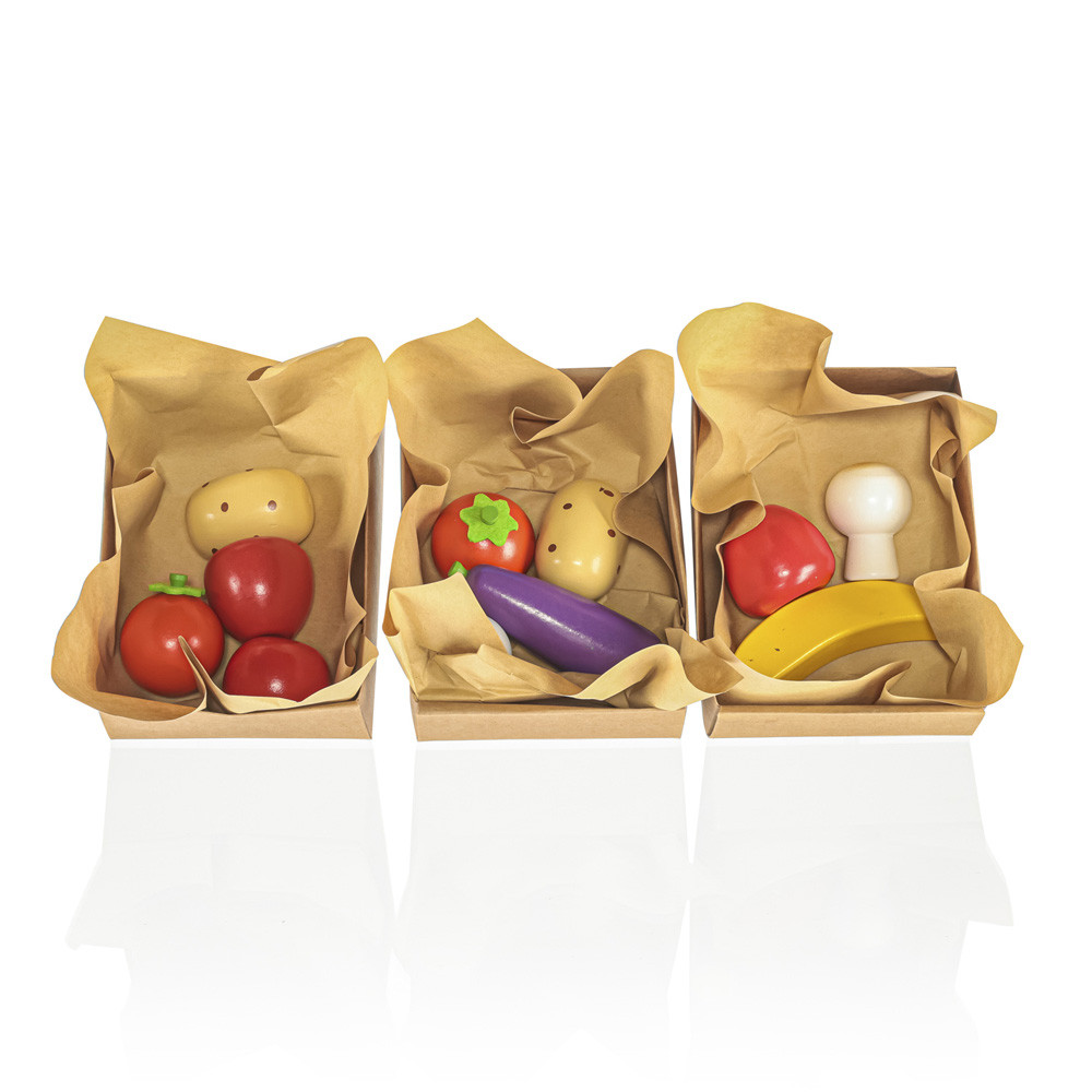 Ez a kisbolti készlet kartondobozokat is tartalmaz papírral a kényelmes vásárláshoz, mérleget, bevásárlólistát és pénzt. A készlet paradicsomot, burgonyát, padlizsánt, banánt és egyéb gyümölcsöket és zöldségeket is tartalmaz, így nem kell mást vásárolni. Gyermekei azonnal elkezdhetnek játszani, és megtapasztalhatják a kereskedés örömét.