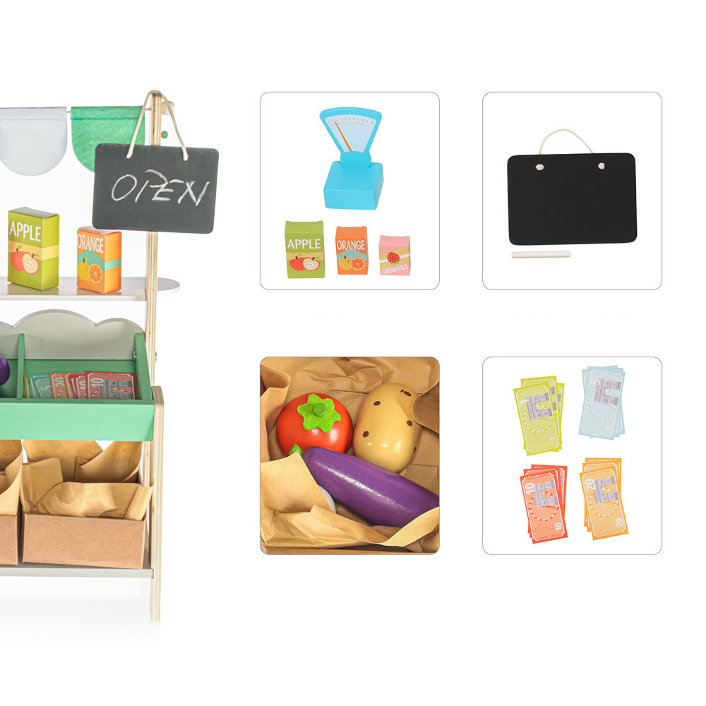 A bódé egy táblával van felszerelve, amelyre a gyerekek krétával felírhatják az árakat és a napi ajánlatokat, vagy maguk határozhatják meg, hogy a stand nyitva vagy zárva van-e. A képzeletnek nincs határa, a gyerekeknek rengeteg kalandban lesz része a kereskedés során. A bódéban három fadoboz található, amelyek úgy néznek ki, mint egy zöldségestõl származó valódi doboz, valamint több fából készült gyümölcs és zöldség.