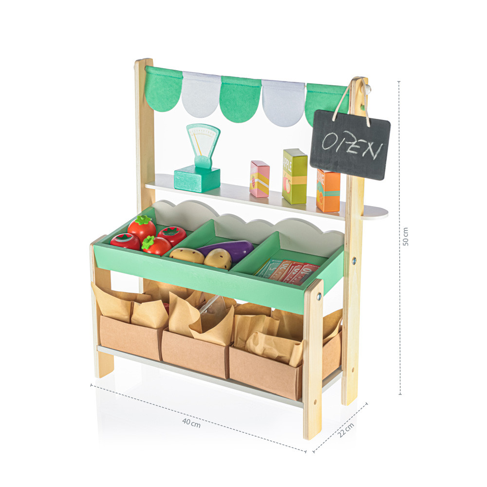 Készítse el saját piacát közvetlenül gyermeke szobájában ezzel a varázslatos fából készült gyümölcs- és zöldségállvánnyal. Ez az autentikus bódé úgy néz ki, mint egy igazi piac, és mind a lányoknak, mind a fiúknak örömet okoz. A gyerekek jól érezhetik magukat a gyönyörû gyümölcsök és zöldségek eladásával a kis boltjukban.