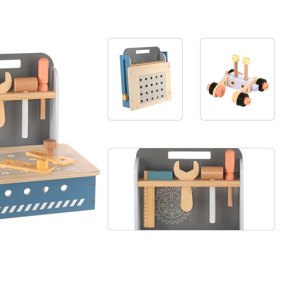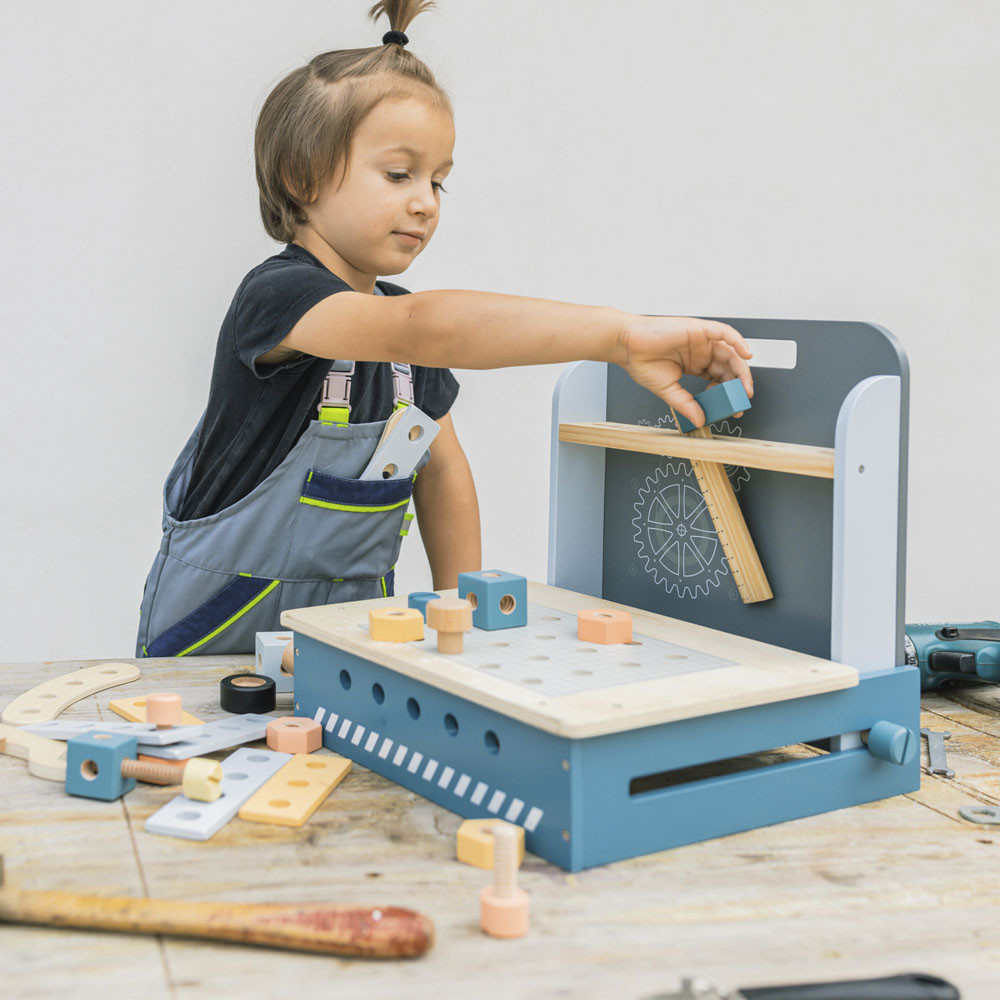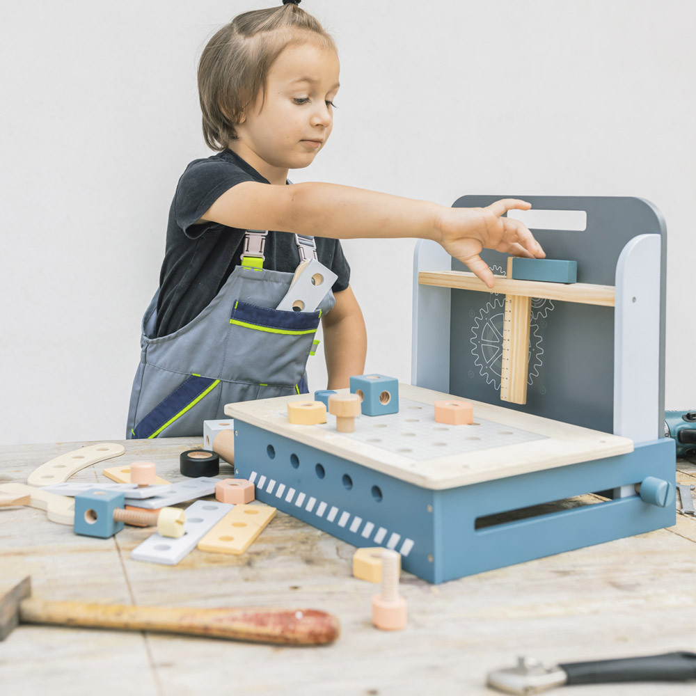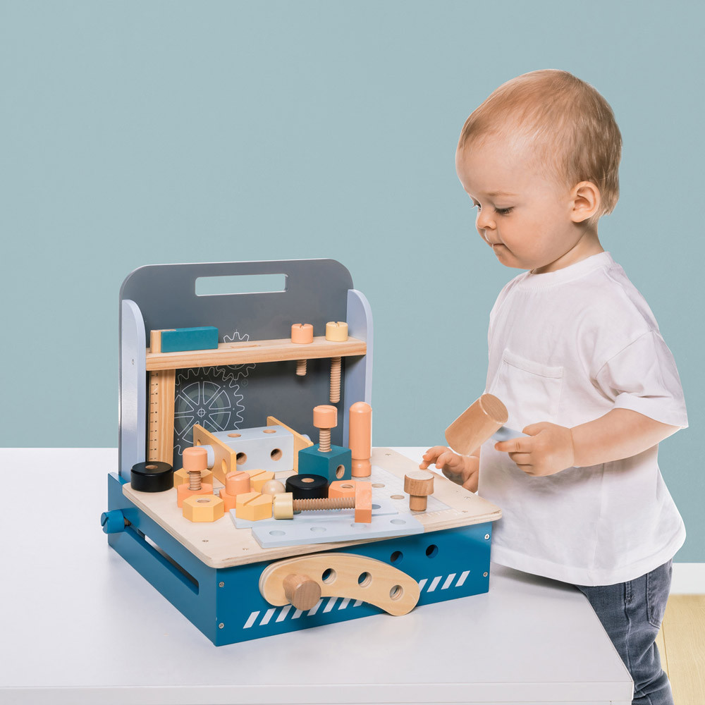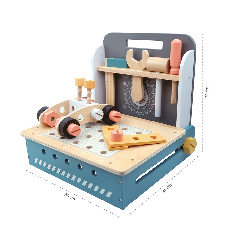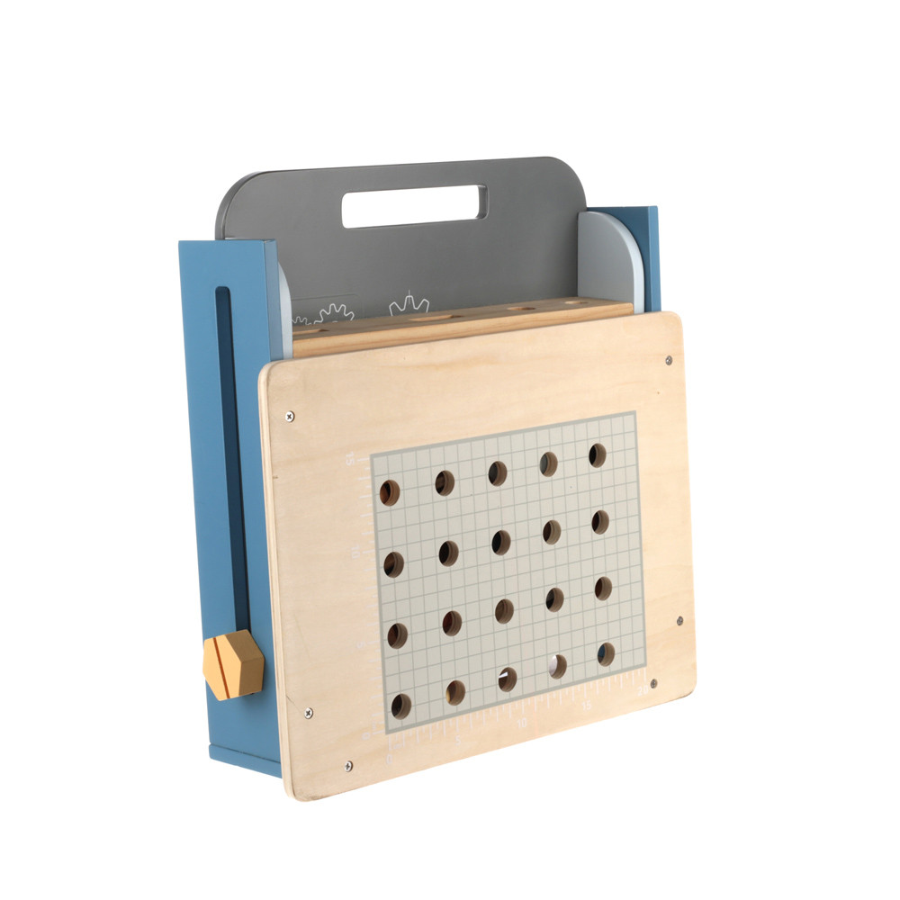 A kompakt összecsukható munkapad számos fa alkatrészt tartalmaz a lyukakkal ellátott falemezektõl a csavarokig és anyákig. A rengeteg összecsukási lehetõségnek köszönhetõen serkenti a gyermek elméjét és támogatja a kreatív gondolkodást. Fejleszti a finom-motorikát és az alapvetõ kézkoordinációt is. Az összecsukható munkapad kiváló minõségû fából és vízbázisú festékekbõl készül.