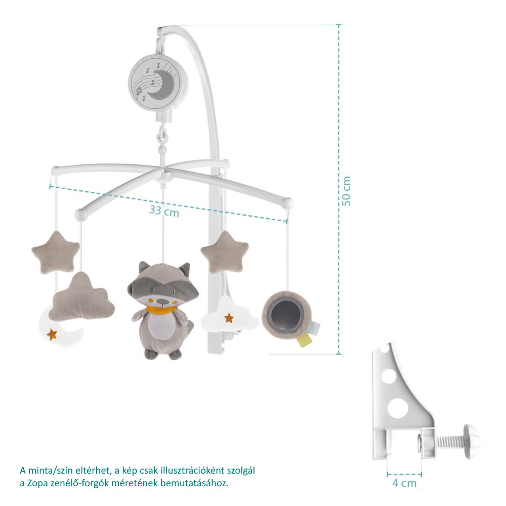 A babák könnyebb elalvása érdekében, valamint, hogy az édesanyák számára az altatás a béke és a nyugalom pillanatai legyenek, a gyermekszobából nem hiányozhat a gyerekágyra szerelhetõ forgó. A Zopa zenélõ-forgó nem csak a babaágy szép díszítõ eleme, hanem egyúttal a baba megszületéstõl kezdõdõen játék és elalvási segédeszköz is.